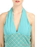 Детали: застежка на молнию на спине, отрезной лиф с бретелью-петлей декорирован плиссе и дополнен плотными чашечками, юбка декорирована плиссе, втачной пояс декорирован сетчатой тканью, пайетками и бисером