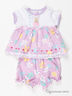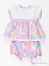 Летнее платьице для девочки расклешенного силуэта. Округлый вырез горловины, короткие рукава. Оригинальный принт и нашивки.