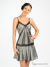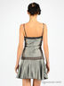 Приталенное атласное платье. Тонкие регулируемые бретельки. V-образный вырез. Застегивается на молнию сбоку. Расклешенная юбка.