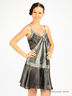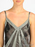 Приталенное атласное платье. Тонкие регулируемые бретельки. V-образный вырез. Застегивается на молнию сбоку. Расклешенная юбка.