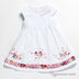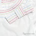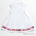 Расклешенная модель с завышенной линией талии застегивается на скрытую молнию на спинке. Вырез горловины и декоративный бантик на нем оформлены контрастной прострочкой. Декоративные складки на полочке и подоле от линии талии. Подол украшен аппликациями, вышивкой, паетками и контрастной вставкой.