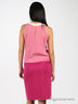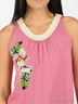 Яркое платье из мягкого трикотажа, без рукавов. Округлый вырез горловины выполнен в виде трикотажной резинки белого цвета. Застежка с двумя перламутровым пуговичками на спинке изделия. Свободный силуэт. Полочка украшена цветочным рисунком. В дополнение к изделию идет трикотажный пояс на шлевках.