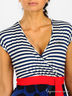 Оригинальное платье приталенного силуэта добавит в ваш гардероб ярких красок. Ткань приятная на ощупь. Верх изделия с запахом обработан трикотажной лентой. Втачной пояс с Широкой лентой. Подол декорирован гипюровой лентой.