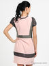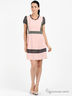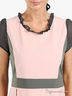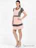 Детали: округлый вырез горловины декорирован шифоновой оборкой, короткий шифоновый рукав "фонарик", скрытая застежка на молнию в левом боковом шве, контрастные вставки