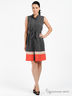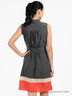 Детали: небольшой ворот-стойка, без рукавов, застежка на пуговицы на полочке, отрезной пояс, декоративная завязка, имитация нагрудного кармана, контрастные вставки по нижней части изделия, сборки на спинке