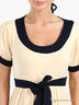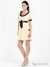 Детали: контрастный округлый вырез горловины, короткий рукав посажен на контрастную манжету, отрезной лиф, контрастный поясок, вставка из многорядной резинки на спинке, складки, два боковых кармана