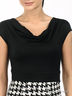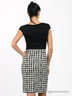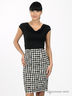 Детали: вырез-качели, скрытая застежка на молнию в левом боковом, фигурные вытачки, контрастный принт на юбке