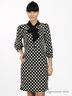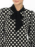 Детали: V-образный вырез горловины, шифоновый ворот переходит в ленты и завязывается в бант, застежка на пуговицы, рукава посажены на манжеты, сборки