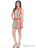 Яркое, слегка расклешенное платье. Круглый вырез, без рукавов, на полочке декоративные пуговицы.