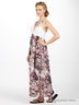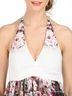 Детали: отрезной лиф с небольшим запахом; завязывается через шею; застегивается на молнию сбоку; юбка декорирована оригинальным принтом