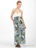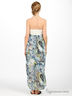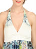 Детали: отрезной лиф с небольшим запахом; завязывается через шею; застегивается на молнию сбоку; юбка декорирована оригинальным принтом