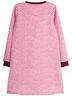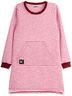 Платье до колена, рукав длинный на манжете, спереди карман "кенгуру". Перед укорочен, в боковых швах разрезы. Изготовлено из петельчатого футера с полиэстером.