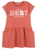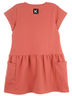 Платье с коротким рукавом. Спереди принт. По отрезной юбке два боковых кармана. Изготовлено из кулирки с эластаном.