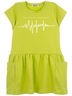 Платье с коротким рукавом. Спереди принт. По отрезной юбке два боковых кармана. Изготовлено из кулирки с эластаном.