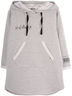 Платье до колена,с длинным рукавом с подворотом и капюшоном треугольной формы. Спереди карман "кенгуру". На груди и на рукаве принт. Принт на груди украшен стразами. Изготовлено из петельчатого футера с эластаном.