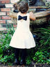 Прекрасное платье из атласной ткани. Фигурный вырез горловины. Широкие лямки. На спинке контрастный крупный бант, расшитый пайетками. Пышная юбка.