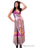 Сарафан прилегающего силуэта, расклешенный к низу, с застежкой на потайную молнию в среднем шве спинки. Полочка с двумя рельефами, двойным лифом со сборкой по нижнему срезу. Проймы окантованы косой бейкой, переходящей в регулируемые бретели и шнуровку спинки, другой конец окантовки образует петлю, в которую пришито кольцо для бретели.