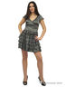 Кокетливое платье в модный «горошек» состоит из лифа, притачного пояса, и юбки с оборками, на подкладке. Изделие с застежкой в левом боковом шве на потайную молнию, с короткими рукавами-крылышками, со сборкой по окату. В боковые швы на уровне талии вставлены полупояса, завязывающиеся на бант по спинке. Спинка состоит из двойной кокетки и кружевной детали. Полочки - с запáхом.
