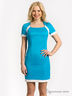 Платье летнее, облегающее по фигуре, с двумя вытачками на лифе, полудлинное выше колена, чуть заужено книзу. Фигурный вырез горловины без отделки, рукав реглан отделан контрастной планкой, в том числе и на стыке с проймой. Нижняя часть лифа имеет контрастную отделку.