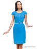 Платье летнее, свободно облегающее по фигуре. Полудлинное, чуть выше колена, заужено. Округлый вырез горловины, декоративная вставка на лифе по типу галстук по всей длине лифа до линии талии и встрочено в талию. Рукав кимоно, короткий. От талии по три защипа на юбке. Белый узкий ремешок.
