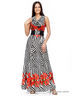 Платье нарядное, длинное в пол. Глубокий вырез горловины, воротник-хомут. Лиф полусвободный. Без рукавов. Юбка расклешенная, на талии широкий пояс, украшенный декоративным тканевым элементом.