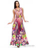 Платье нарядное, длинное в пол. Глубокий вырез горловины, воротник-хомут. Лиф полусвободный. Без рукавов. Юбка расклешенная, на талии широкий пояс, украшенный декоративным тканевым цветком.