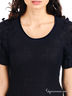 Детали: округлый вырез горловины окантован бархатной ленточкой, короткий вязаный рукав с декоративными элементами, декоративная вязка основы изделия