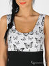 Платье трикотажное с завышенной линией талии. Без рукавов. Отрезной лиф белого цвета декорирован рисунками-принтами в виде бабочек. Втачной пояс. Приталенный силуэт.