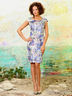 Платье прямого силуэта с очень сложным кроем: подрезы по переду и спинке придают стройность этому изделию. Живопись импрессионистов придаёт принту этого изделия особую эксклюзивность. Вырез горловины украшен французской металлической брошью.