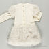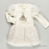 Детали: округлый вырез горловины, застежка на пуговицы на спинке, короткий рукав-фонарик, длинный трикотажный рукав, юбка-баллон, полочка украшена аппликацией и стразами