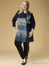 Стильная туника полуприталенного силуэта. Округлый вырез горловины. Длинные облегающие рукава. Полочка дополнена вставкой из узорной ткани.