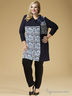 Стильная туника полуприталенного силуэта. Округлый вырез горловины. Длинные облегающие рукава. Полочка дополнена вставкой из узорной ткани.