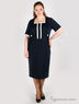 Изящное платье из плотного материала. Полуприталенный силуэт. Вырез горловины - каре. Прямые рукава длиной до локтя. Прямая юбка. Сзади на подоле расположена шлица. Платье декорировано контрастными вставками.