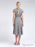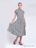 Великолепное платье из легкой ткани с мелким оригинальным принтом. Стояче-отложной ворот. Застежка на планку с пуговицами. Короткие свободные рукава. Отрезная расклешенная юбка.