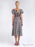 Воздушное платье из хлопковой ткани. Вырез горловины - лодочка. Короткие рукава с буфами. Верх полочки и спинки и рукава декорированы оборками. Отрезная юбка длиной ниже колена.
