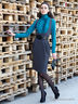 Платье-сарафан, отрезное по талии, к низу зауженное . Сзади-шлица, по переду глубокий круглый вырез, защипы по талии.