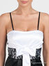 Материал: отрезной топ, стильный бант украшает изделие, оригинальная сборка по лифу, стильная отделка гипюром по поясу, застежка на молнии по спинке.