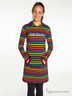 Платье в разноцветную полоску с капюшоном и длинными рукавами. Круглый вырез горловины. Прямой крой. Карман-кенгуру спереди. Логотип на груди. Размер по росту в см.