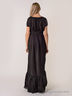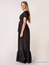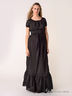 Детали: округлый вырез горловины и рукава присборены на резинку, подол длинной юбки декорирован воланом, модель дополнена широким поясом.