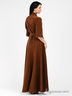 Стильное длинное платье из плотной, пластичной, приятной на ощупь ткани. Фигурный вырез горловины. Воротник-стойка. Эффектные короткие рукава-регланы с односторонними складками. Застежка спереди на кнопки. Отрезная юбка-полусолнце. Два кармана в швах.
