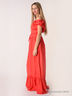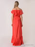 Детали: округлый вырез горловины и рукава присборены на резинку, подол длинной юбки декорирован воланом, модель дополнена широким поясом.