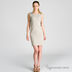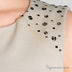 Классическое бежевое платье без рукавов, прямого, приталенного кроя с разрезом сзади. Круглый вырез горловины, декор в виде клепок на плечах.