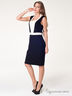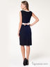 Платье футляр на подкладке, приталенного силуэта, отрезное по линии талии, длиной до середины колена. Вырез горловины оформлен контрастной отделкой. По линии талии на спинке расположен бант. В боковом шве расположена молния.