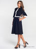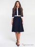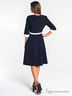 Платье с пышной юбкой в складку, приталенного силуэта, длиной чуть ниже колена. Контрастная планка, пояс и манжеты выступают акцентами модели. Прилегание обеспечивают рельефы выходящие из проймы. Потайная молния расположена по центру спинки.