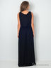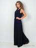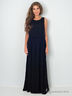 Однотонное платье длиной в пол без рукавов, круглый вырез горловины. Пояс собран на резинку.