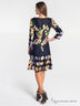 Шелковое приталенное платье с оборкой, длиной ниже колена. Платье на подкладке и рукавом три четверти. Прилегание обеспечивают талиевые вытачки выполненные на полочке и спинке изделия. По центру спинки расположена потайная молния.