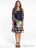 Шелковое приталенное платье с оборкой, длиной ниже колена. Платье на подкладке и рукавом три четверти. Прилегание обеспечивают талиевые вытачки выполненные на полочке и спинке изделия. По центру спинки расположена потайная молния.