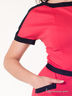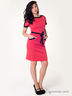 Трикотажное платье, приталенного силуэта и цельнокроеным рукавом. Отделка на рукавах и карманах платья выполнена из перфорированной замши. В комплекте так же идет пояс из замши.