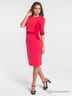 Трикотажное платье, с круглым вырезом горловины и рукавом длиной три четверти. Прилегание по лифу платья на полочке обеспечивают рельефы, на спинке талиевые вытачки. По спинке платья вставлена потайная молния.