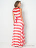 Полосатое шифоновое платье с юбкой полусолнце длиной в пол. Лиф платья выполнен в корсажном стиле, с подкладкой начинающейся чуть выше линии груди. В боковом шве потайная молния. По талии притачной пояс из основного материала.